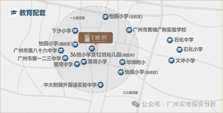 项目自身配建一所12班幼儿园已经在装修和一所36班小学已官宣引入怡园小学。周边还有下沙小学、港湾小学等。广大附中黄埔实验学校、广州市八十六中学等。