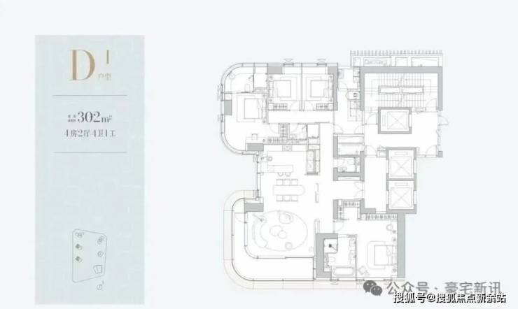 1D栋(1栋四单元)-45层:均为3梯2户,约302㎡,一层两户。