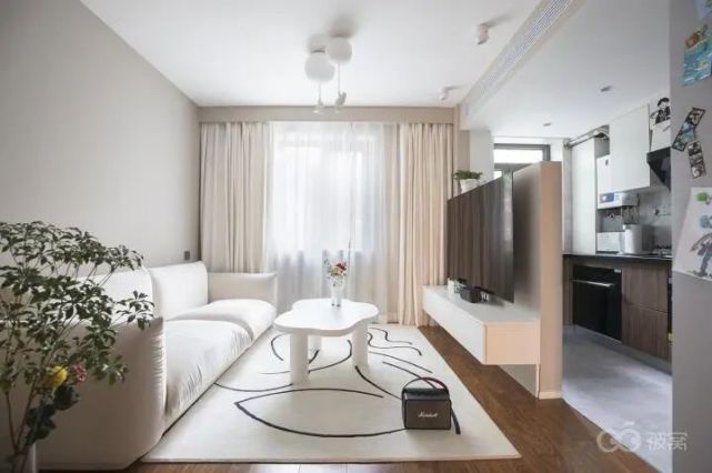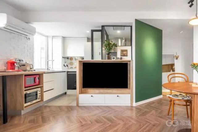 想做敞开式厨房,如果把厨房和客厅之间的隔墙全部敲掉,电视就没处放。不如只砸掉上半部分,客厅与厨房保持相互连接又各自分开的空间关系。隔墙一面挂电视,一面用来厨房墙面储物。