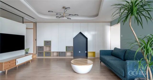 这个案例的电视背景墙利用了客厅里新增的多功能房间的墙面,顶棚还暗藏了投影幕布。客厅比较完整的一面墙则全部贡献给储物和小孩子的游戏区。