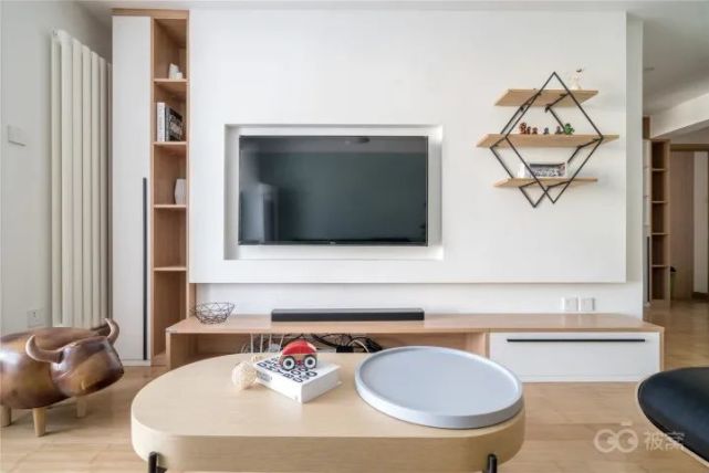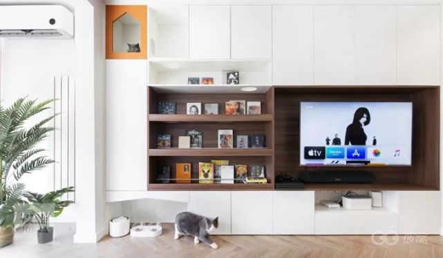 这个客厅柜是男主人亲自参与设计的,集合了电视、储物、展示和猫爬架功能。配色简单,清爽不杂乱。