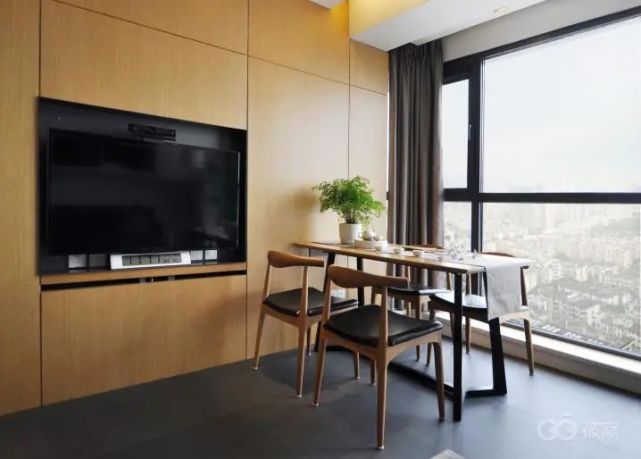 餐桌特意摆在客厅落地窗前,希望享受美食的同时也能欣赏窗边风景。墙面整体采用榆木饰面,电视机嵌入墙面中,为了保持墙面色彩统一,厨房门也做了隐形处理。