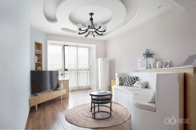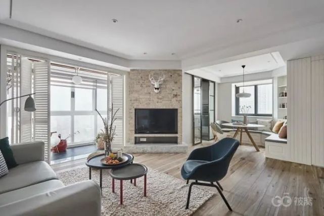 沙发和电视面对面显得过于正统,设计师想出来“将空间扭一扭”的好办法。