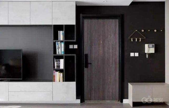 这个案例中,从入户玄关便涂刷了黑色的墙面漆。储物系统只做了上下柜,中间没有使用背板,黑色墙面漆一直延伸过来,电视机屏幕与之融为一体,视觉效果完整。