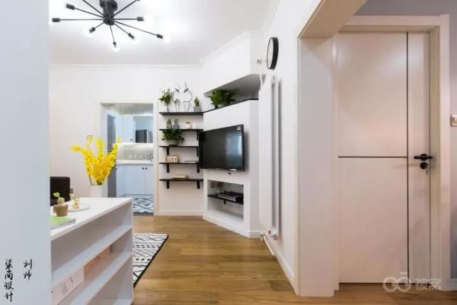 这个户型是客餐厅连通的,没有完整的电视背景墙是它的短板。设计师利用阳台和厨房的墙体,做了斜面电视背景墙。
