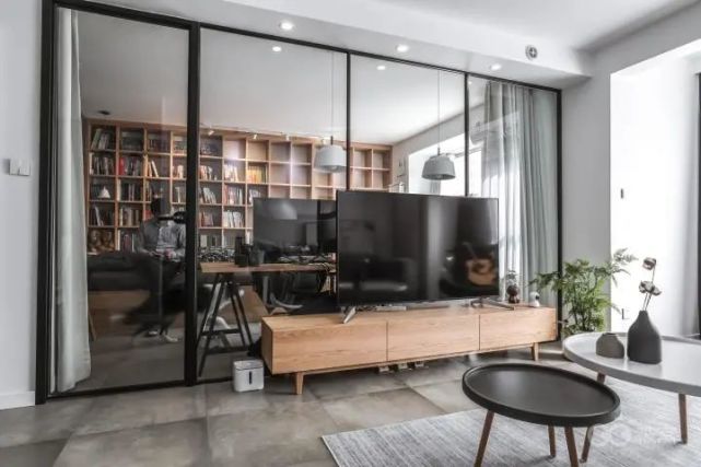 客厅和书房相邻,用玻璃做隔断,开放式空间的互动,构成整个房子里最舒适的一角。落地玻璃隔断即为电视背景墙,透过玻璃,动静交替。