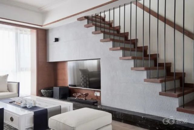 将楼梯移位到一边,客厅空间更通透敞亮了,刚好利用楼梯下空间做电视背景墙,壁龛设计将电视机和影音设备全部纳入其中。