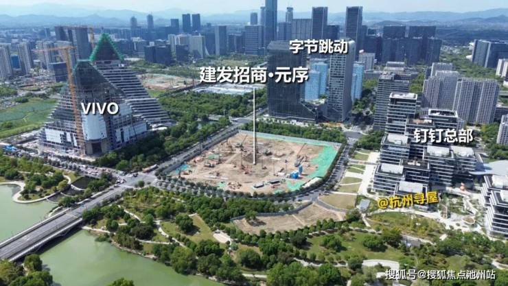 再看项目周边,东侧为钉钉总部,北侧为字节跳动华东中心,西侧为VIVO全球AI研发中心,南侧为河道和沿河阿里公园。