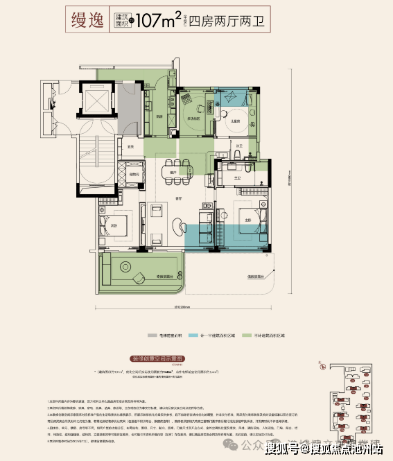 建面约107平四房两厅两卫真四代:不含电梯前室,优化后得房率约130%!
