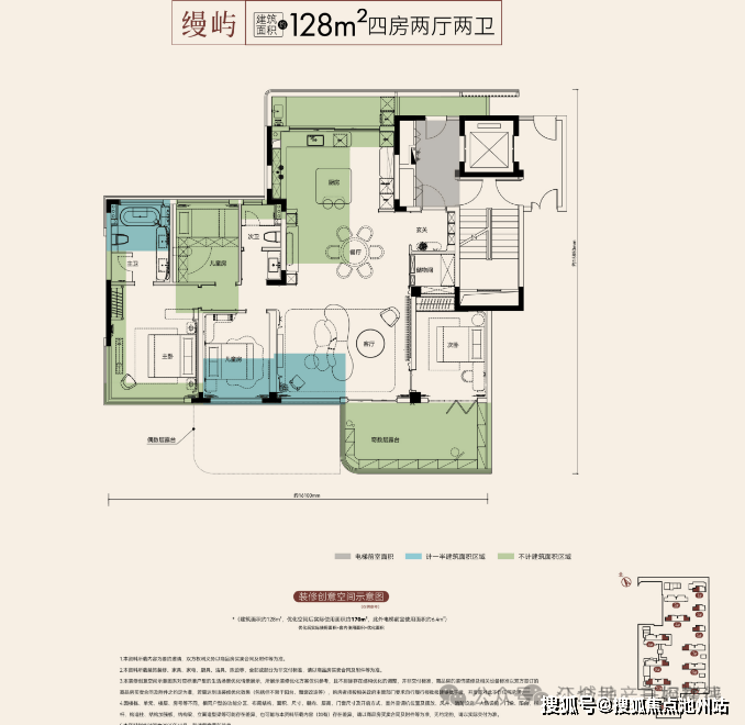 建面约128平四房两厅两卫真四代:不含电梯前室,优化后得房率约133%!