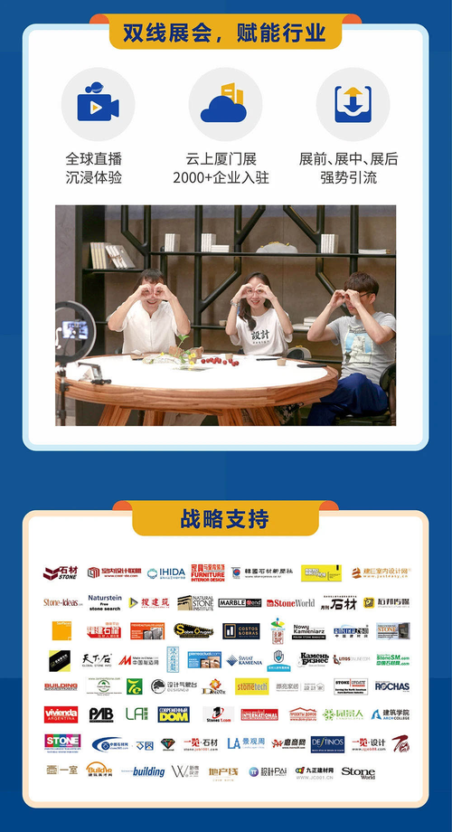新浪家居等媒体携手聚力,将在展前、展中、展后全面发挥传播能力,进行深度发散;全国总编将亲临现场,通过线上直播、沙龙、逛展、采访等多种形式不间断地制造话题,输出内容。同时邀请设计师大咖和行业专家,开展直播逛展等活动,为无法亲临现场的展客商提供在线撮合的贸易平台,为全球石材人提供沉浸式观展体验,线上线下的同期活动内容均可通过云平台呈现。