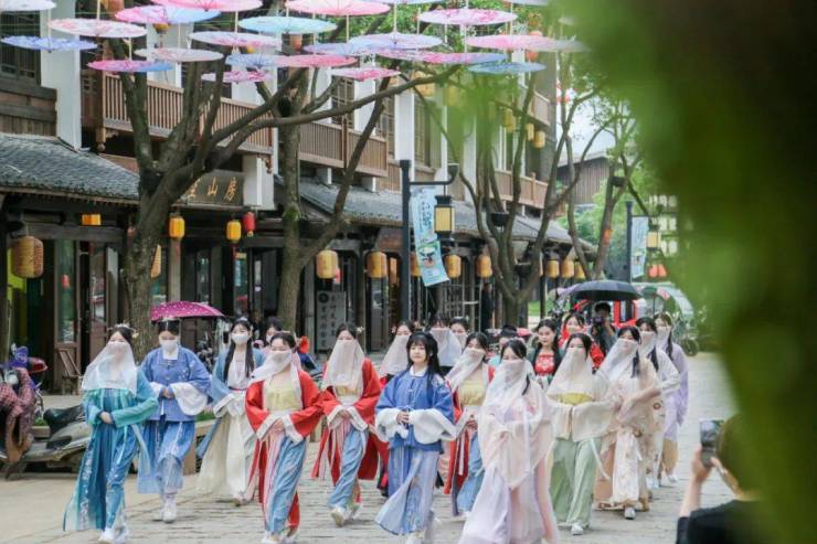 奇创旅游集团各大景区也结合各自特色推出了国风主题活动,在五一期间成为当地游客打卡的热门目的地。位于江西吉安的吉州窑景区,五一期间以“宋文化体验”为核心举办宋潮文化旅游节,游客换上一身雅致的宋制汉服,点上大宋风靡的珍珠仿妆,挑战宋时风靡的投壶射箭,再吃上一份“豆腐西施”亲自手作“十大赣菜”之一的永和豆腐,在沉浸式体验中充分感受到吉州窑薪火相传的宋代遗风。而位于江西景德镇的高岭·中国村景区,以国风汉服节为主题举办《汉唐大赏 盛世花开》一系列沉浸式体验活动,如汉服快闪巡街、大唐演艺等多个趣味项目吸引了众多当地市民游客前来进行沉浸式的体验与参与。位于湖州吴兴区八里店镇潞村的世界乡村旅游小镇,以丝绸文化和宋韵文化为切入点举办丝潞文化节,结合丰富多彩的活动,让游客一起感受历史传承下的美丽小镇、宋韵文化和丝绸文化。五一节假日前三天,世界乡村旅游小镇安全有序接待游客近3万人,更入围了抖音平台湖州市景点种草榜前十。