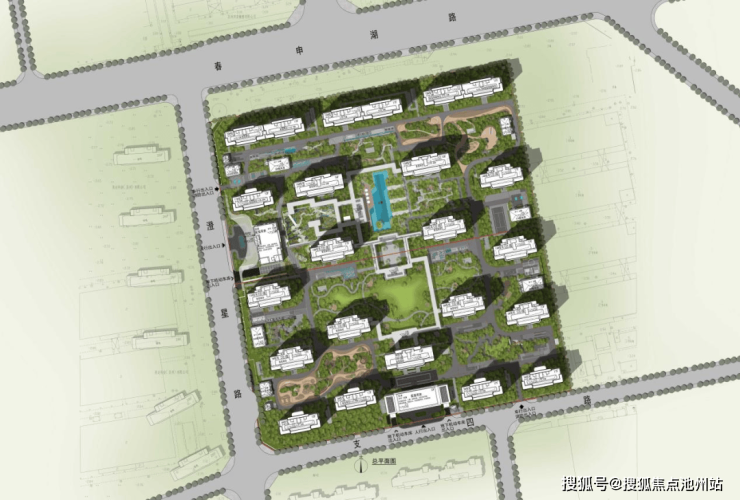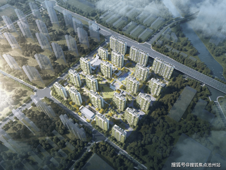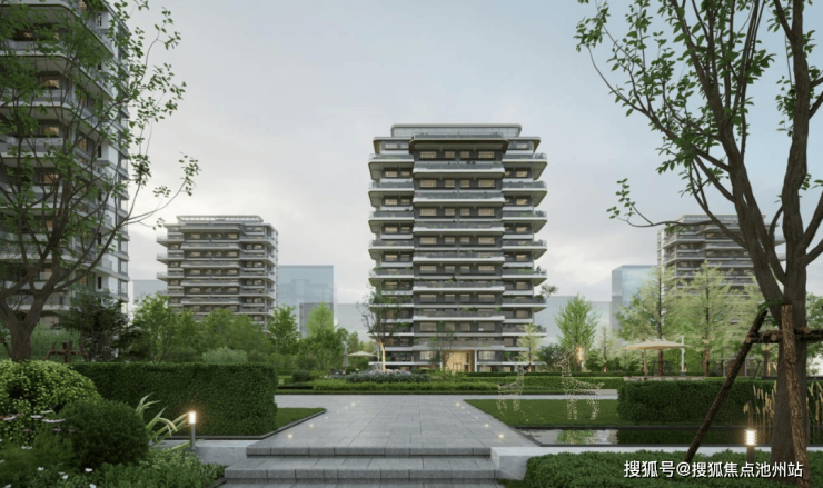 项目规划布置20栋高层住宅,层数在12F-17F之间。楼宇采用错位布局的方式,形成"城市森林岛屿"的视觉效果;在地块内部围合1000㎡下沉庭院花园,同时融入苏州园林造景手法,形成户户享有立体庭院景观,实现"推窗见绿"的生活体验。
