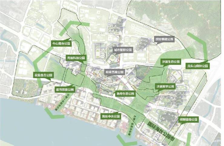 9个特色主题公园:海丝科技公园、都市农田公园、岭南艺境公园、沙浦国学公园、城市塑影公园、缤纷童趣公园、龙舟生态公园、远洋文化公园、桥畔运动公园。