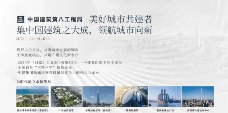 中建海丝城:作为中建八局倾力打造的首个央地合作项目,以大盘造城理念共筑未来城市,打造一个立于珠江之畔,海丝明珠的理想生活新世界。