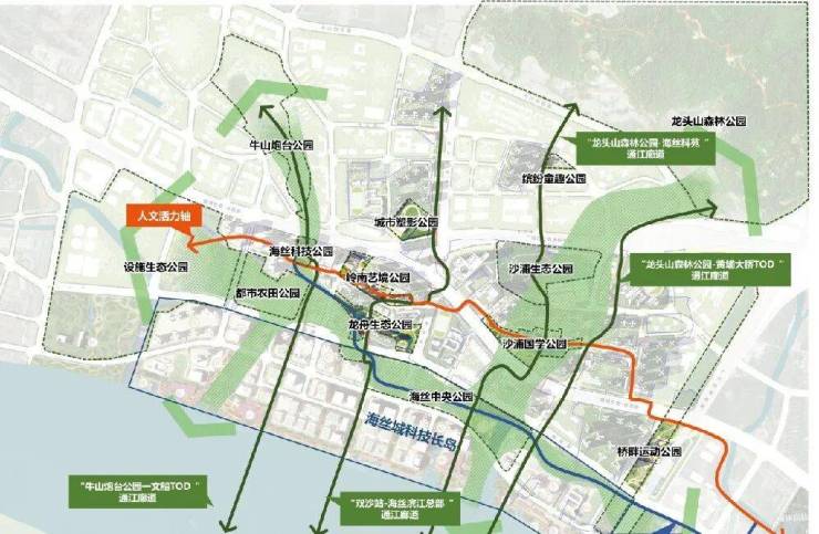 绿色出行:交通网络组织优化,细化海丝城通江廊道,构建慢行空间系统、通山达海漫游路径;构造海绵城市和韧性城市;努力建设打造绿色低碳超低能耗建筑项目。