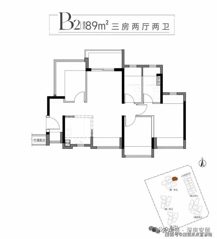 89m²的3房2厅2卫,B1户型,设计的是竖厅南北通透格局,进门入户玄关,客餐厅分离设计,五开间朝南,主卧南北双飘窗,次卧270°无柱飘窗,U型厨房,卫生间干湿分离,得房率95-101%(包含赠送),阳台主朝西北向。光明新房市场少有的89平竖厅南北通户型