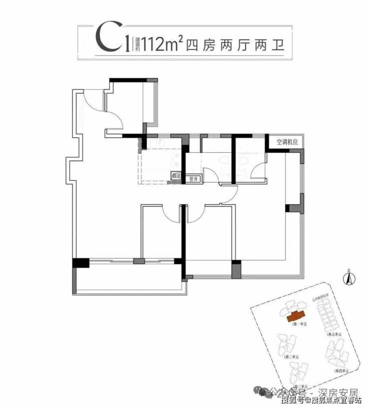 112m²的4房2厅2卫,C1户型,设计的是经典竖厅格局,LDKB一体化,S墙设计预留冰箱卡槽位,动静分区,四开间朝南,U型厨房,卫生间干湿分离,得房率95-101%(包含赠送),东南朝向看小区园林景观。主卧270度转角无柱飘窗