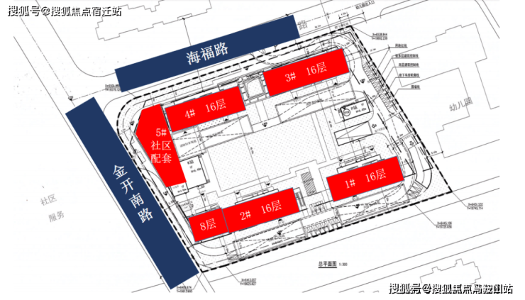目前设计方案已发布,计容面积约2.72万方,普通商品房用地占地面积约1.36万方,容积率2.0,限高50米,住宅套数下限288套,套均面积约94.4㎡,主要由4栋16层住宅和1栋社区配套组成。
