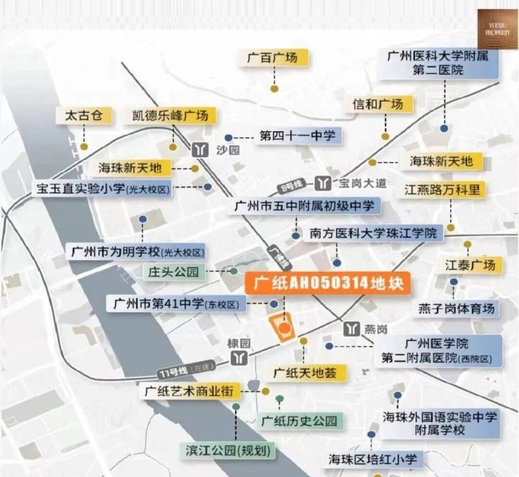 项目自身没有配建学校,但周边名校环伺,3km直线范围内包含广州市五中附属初级中学(省级)、广州市第41中学(省级)、宝玉直实验小学(光大校区)、江南外国语学校、工业大道中小学、红棉小学、海富小学、南燕小学、培红小学等9所学校环伺,拥有完善的区域教育体系。