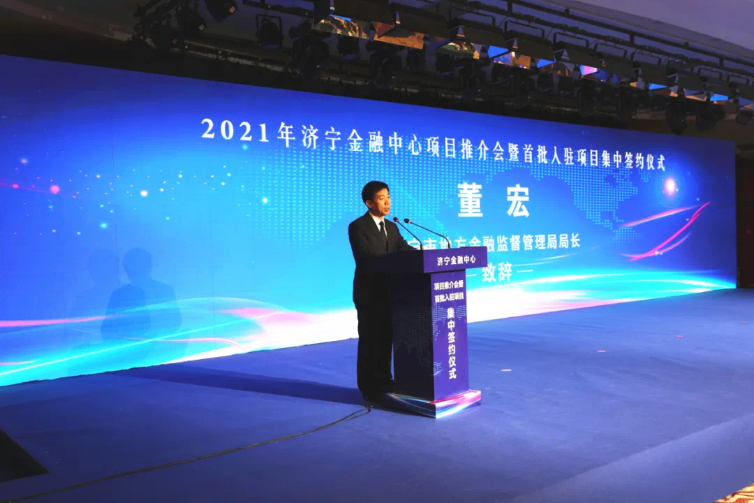 董宏在致辞中表示,济宁金融中心作为市一级星标项目,全市各界关注度高,太白湖新区党工委、管委会不辱使命,成立项目建设专班靠上推进,在市委、市政府和市区挂图作战建设指挥部指导下,项目于2020年9月22日正式开工,正大干快上全速推进建设。市地方金融监管局作为市级行业主管单位全力支持项目建设发展,联合太白湖新区管委会研究制定项目招引扶持政策,同步开展招商引资工作,招引成果取得首批15家金融和产业机构集中签约入驻的“开门红”,为济宁金融中心未来建设发展取得良好开端。