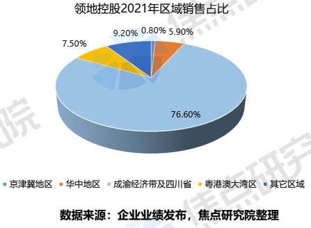销售过于集中存在政策风险。从企业营收业务分布来看,物业开发销售为公司营收的主要来源,占比为99%,其它多元化业务占比较小。从销售额分布区域来看,京津冀地区、华中地区、成渝经济带及四川省、粤港澳大湾区贡献的合约销售分别占领地2021年合约销售总额的0.8%、5.9%、76.6%及7.5%。领地控股起步于四川,现阶段销售收入仍旧较为依赖成渝经济带及四川省,占比由2020年的74%上升至76.6%。由于企业业务收入来源单一,且销售区域多集中在成渝经济带及四川省,未来销售推盘更易受到地方紧缩调控政策影响,如:限价/限售/限贷等。
