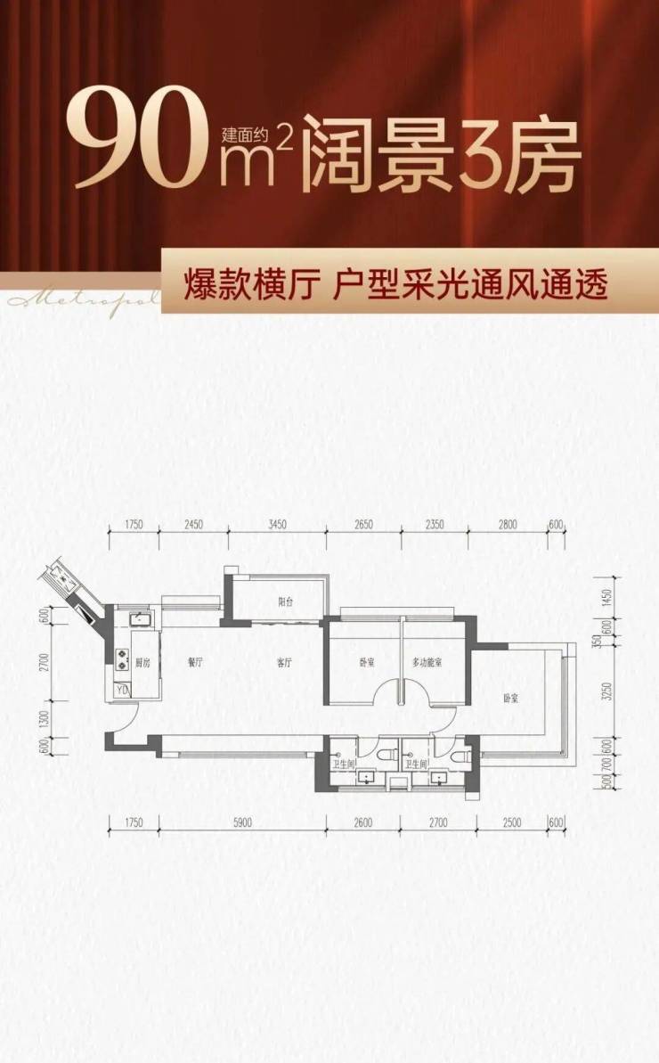 90㎡的3房2厅2卫,南北通大横厅户型,动静分区全明户型,U型厨房,餐客厅一体,客厅开间约5.9米,三个房间和客厅都带大飘窗,主卧双飘窗带独立卫生间。