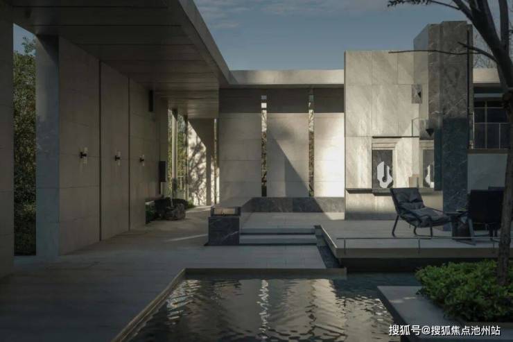 穿林而过,门庭景墙沿着场地舒展开来,仿若画卷,为空间带来流动性和方向感。流水搭配沉石,动与静交融,丰富了门庭感官层次,引人入胜。