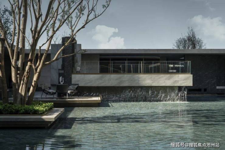 沿门庭而入,一碧如镜,理水植绿。格栅与留白手法间隔,以回形连廊围合水院,引领着游人以游园的形式逐一探访水院各色社交空间。