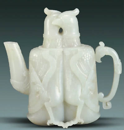 武汉博物馆玉器收藏品类丰富,此次精选200余件各时期玉器参与展览,既有新石器时代的重要礼器神面纹玉琮,又有凸显盛唐气象的龙纹玉佩,还有体现清代高超制玉技艺的白玉福寿纹葫芦形壶、白玉人物船等。其中,清“乾隆”款青玉双凤交颈壶格外引人注目。这件玉壶造型精巧别致,研琢严谨规矩,纹饰婉约柔美,是中国制玉工艺鼎盛时期的杰作。它的玉质青白无瑕、晶莹温润,造型为两只交颈互拥的联体雏凤,取“双凤合颈(卺)”之意。羽毛似鳞片而富有层次,熠熠生辉。壶颈雕蝴蝶状结绳,将两只凤鸟系在一起;结绳上又挂两条飘逸的回纹绶带,分披于凤身,象征着富贵吉祥。流和柄分置于两只凤鸟的背上。流弯曲直上,其根部饰有兽首,怒目圆睁,额与鼻被设计成如意云头纹。壶柄呈曲凤形,凤冠微翘,尾端外卷,呈呼应之势。从器型分析,这件玉壶应是宫中新人举行大婚之礼时所用的合卺之物。壶底刻有“乾隆御制”填金撰篆书款,是乾隆时期玉雕中的精品。