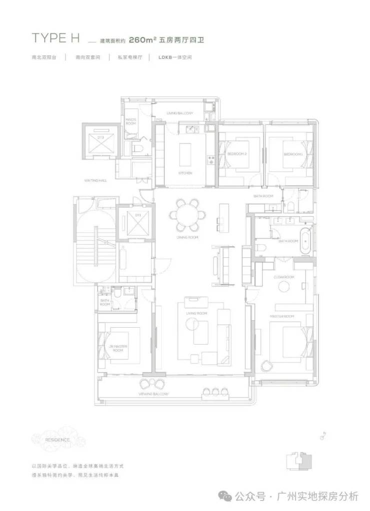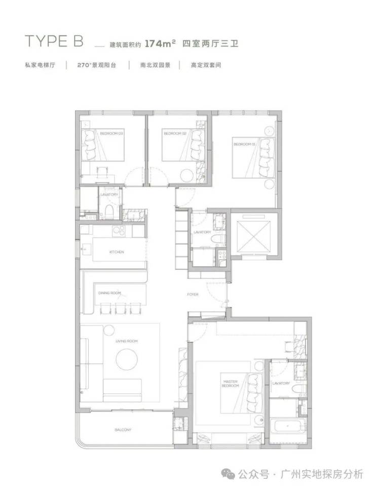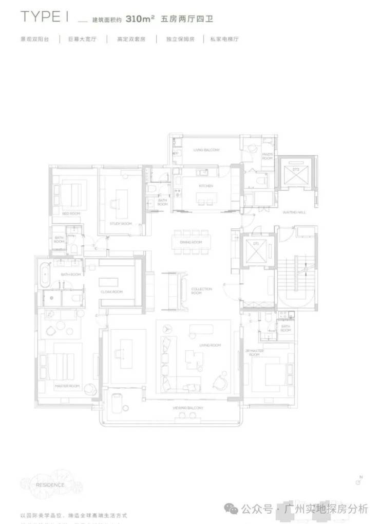 3、产品设计高端,采用板式小高层设计,专梯专户,私家电梯厅保障隐私;户型面积从145㎡起最大达315㎡,空间布局灵活,部分户型配备270°环幕阳台、巨幕宽厅等,满足高端居住需求。