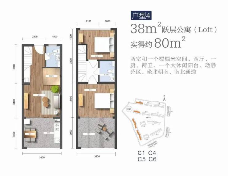 建筑面积38㎡,一室一卫,可变换两室,坐北朝南,南北通透,硬装交付