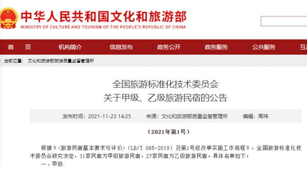 近日,文化和旅游部发布《全国旅游标准化技术委员会关于甲级、乙级旅游民宿的公告》,公告内容如下:
