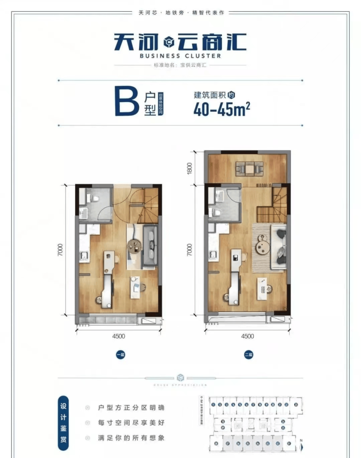 天河云商汇项目规划8栋创意空间和19栋企业总部及少量商铺,其中,32-58平商业单位,176-970平企业总部,总套数约1700套。 南北朝向,通风采光观景俱佳项目容积率仅2.0,全市罕有,筑造创意空间及企业公馆两大产品系,打造成集泛会所、创新创业、社交平台、休闲娱乐等于一体的全能型理享生活家场域,描绘令人期待的全新蓝图。