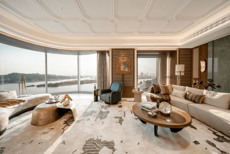 项目深谙塔尖人群的多元精神需求,独创两套室内美学提案。一套取意都喜天丽的温润之境。以简约留白与金属收边,让空间成为承载光影与情绪的容器。晨起时,江风穿堂而过;日暮时,落日为室内镀上暖金。另一套为致敬“香奈儿”黑金美学,以精致材质与几何韵律诠释新潮锋芒,将居所升华为居住者精神品位的外化延伸。