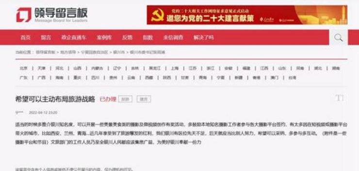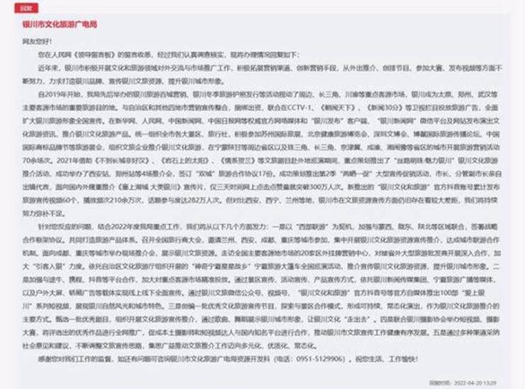 收到留言后,银川市文化旅游广电局公开作出回复。回复称,近年来,银川市积极开展文化和旅游领域对外交流与市场推广工作,积极拓展营销渠道、创新营销手段,从外出推介、创排节目、参加大赛、发布视频等方面不断努力,力求打造银川品牌、宣传银川文旅资源、提升银川城市形象。