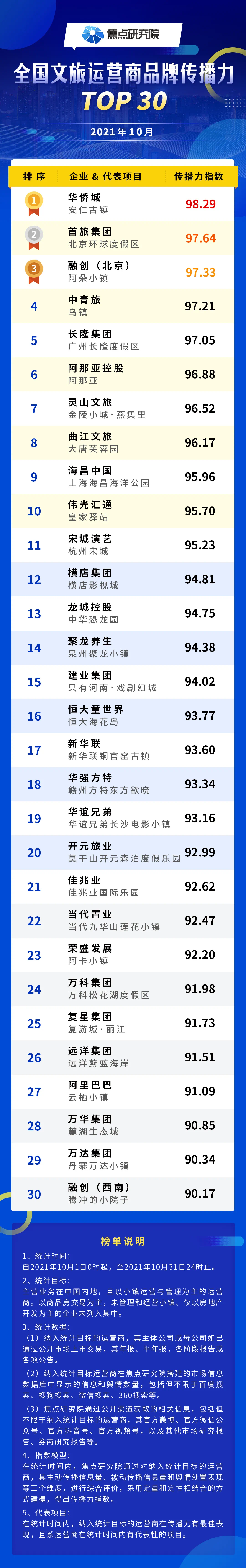 权威发布 | 10月全国文旅运营商品牌传播力TO30