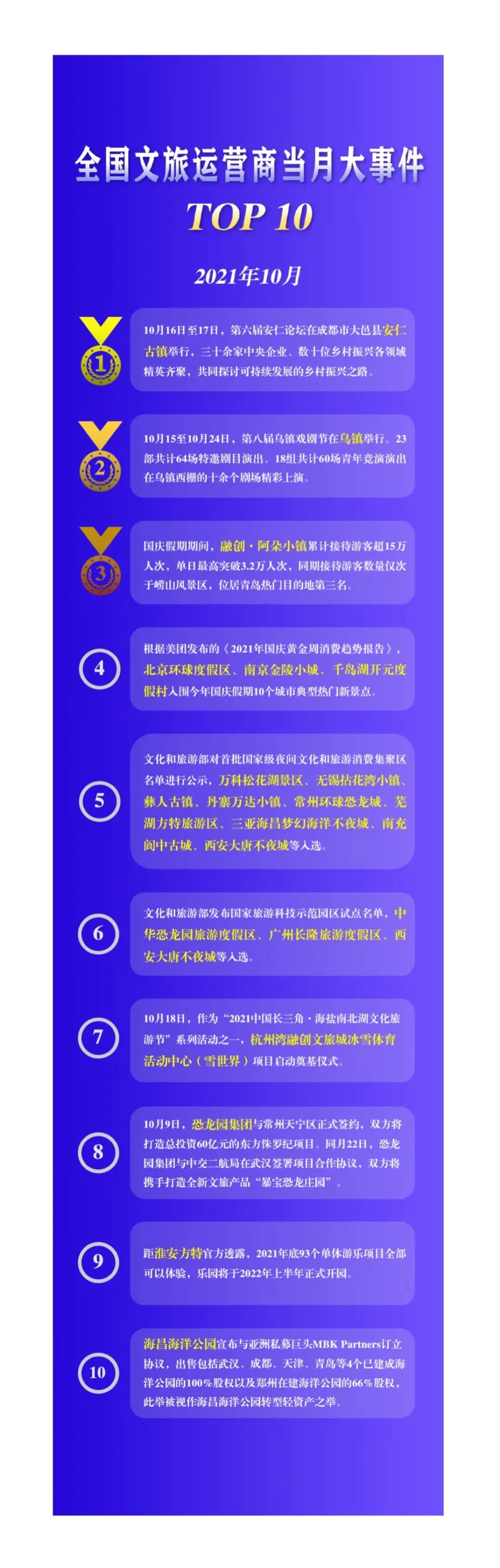 文旅行业向来有“金九银十”的概念,在这个10月里,尽管新冠疫情对于行业的影响持续升级,但各文旅运营商们并未止步不前,依然在逆势中不断地迭代进化。基于此,我们试图总结出各上榜运营商及旗下项目的“当月大事件”,以观这些文旅行业的中坚力量们如何在疫情反复的当下破旧立新、变危机为生机。