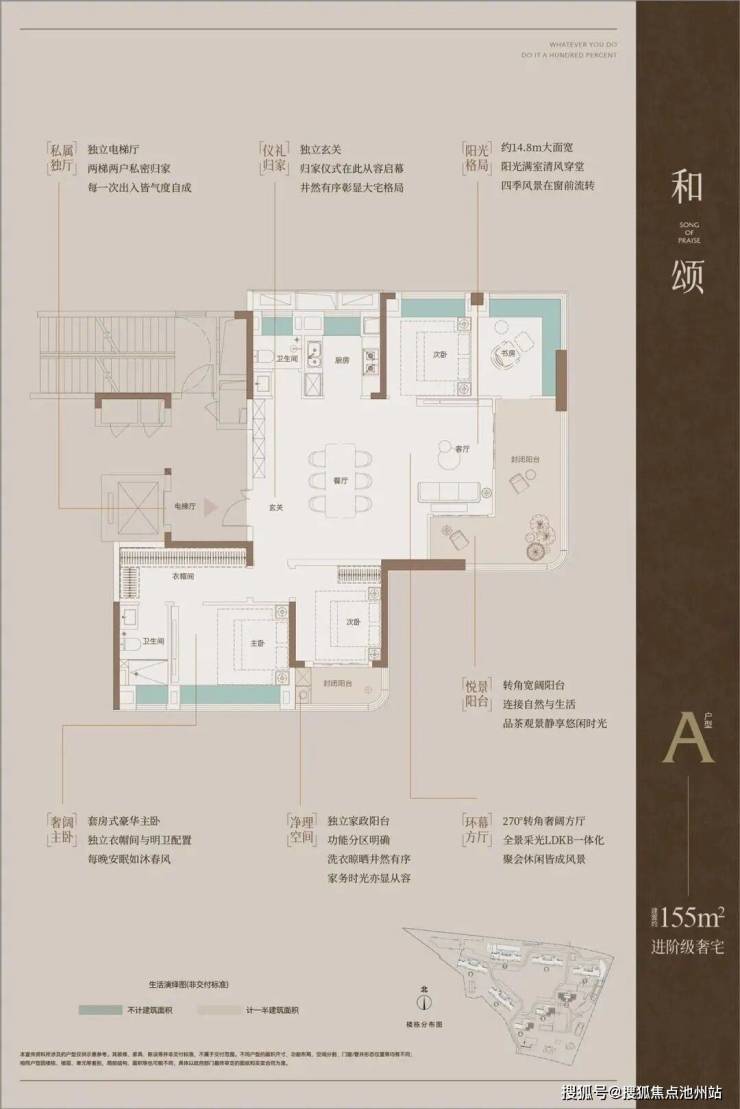 招商·原颂建面约155㎡户型,因户均赠送约11㎡阳台空间,综合得房率高达约95%。折算成实际可使用的套内面积单价,其价值优势将更为突出。