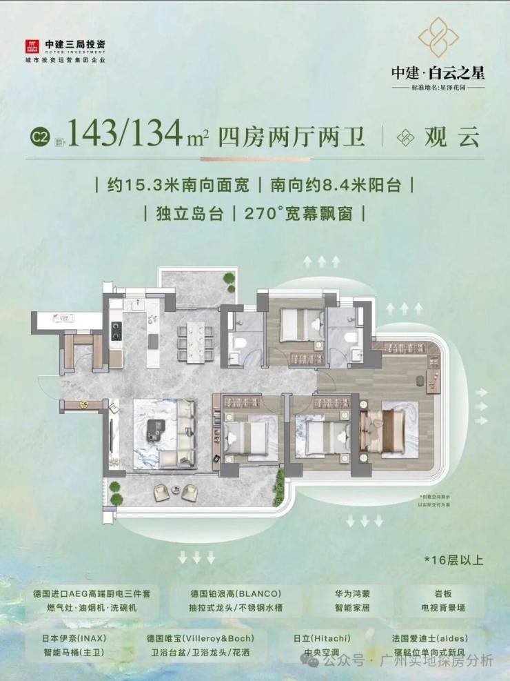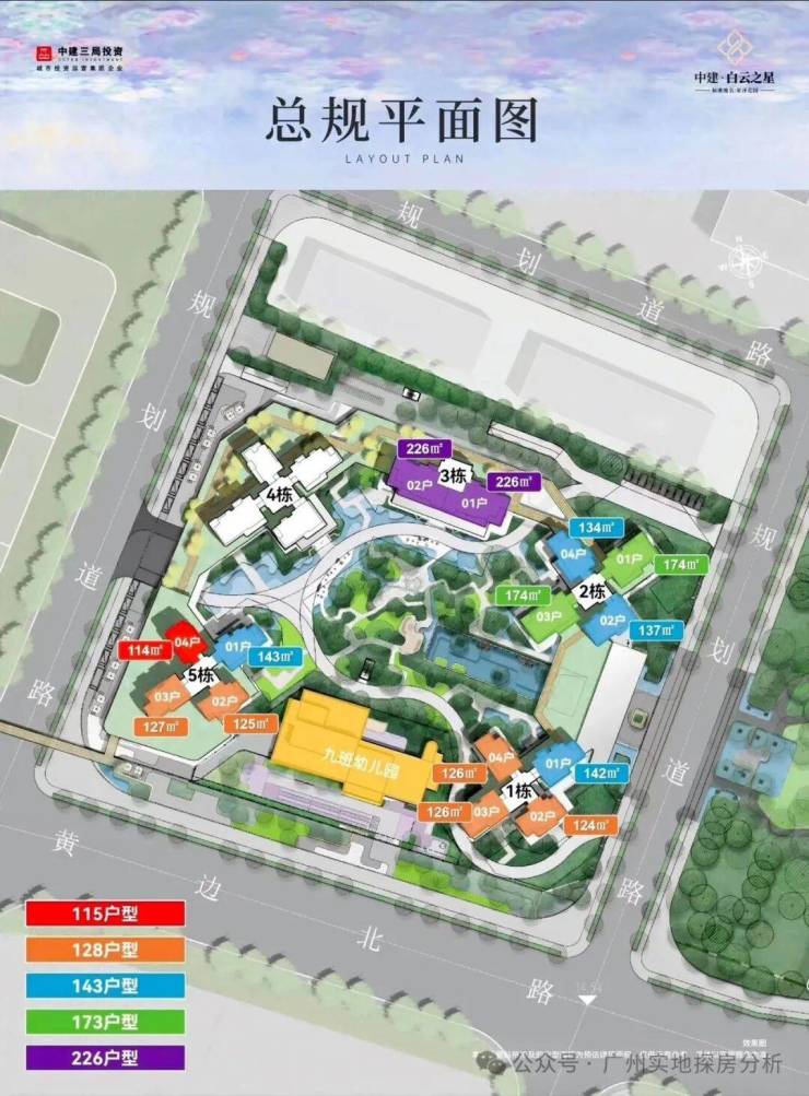 一、项目基本信息开发商:中建三局✖白云开发备案名:星泽花园开盘时间:2025年6月14日交付时间:2027年12月31日,精装华为智能占地面积:85万㎡,首开占地2.43万平方米总建筑面积:约112万㎡,首开约11万平方米总栋数:首个融资组团只有5栋总户数:首开705户总层高:首开42-45层梯户比:3梯4户、2梯2户使用率:超100%绿化率:35%容积率:3.33总车位:1322个,1:1.98物业公司:中海物业,5.6元/平/月产品:115平、128平、143平、173平、226平