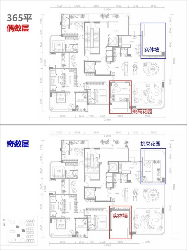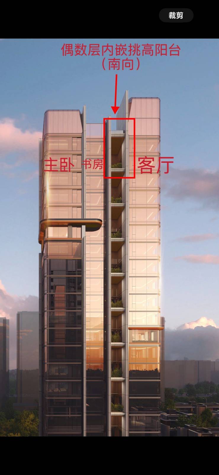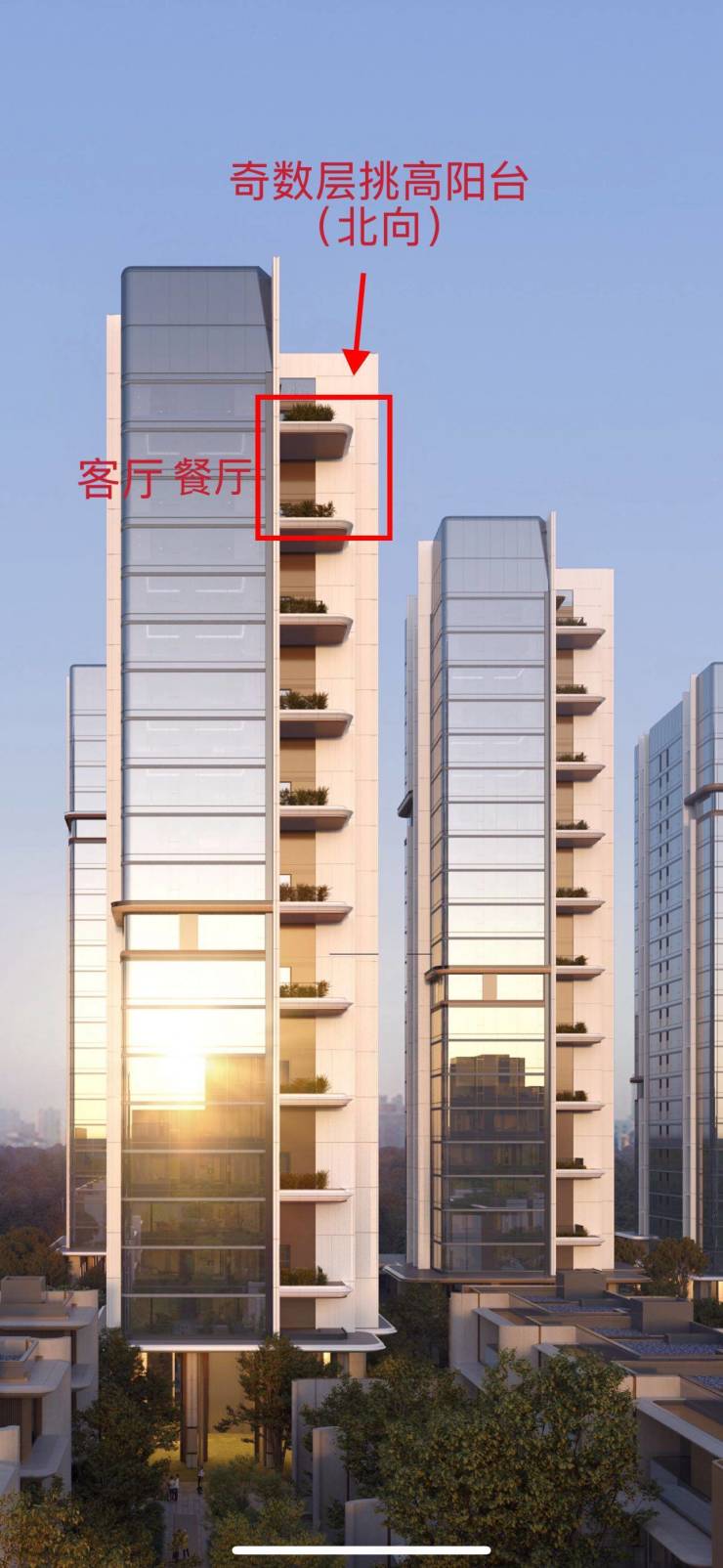 第二,每户都有近7米通高的主花园露台,与楼王户型一样采用「错层式+内凹结构」设计,提供优于传统阳台的实用面积与层次感。