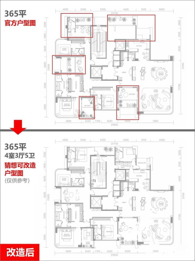 1、3套房,5卧室,家庭人口多的也很适合。空间可塑性很大,也可改成豪华4套房。