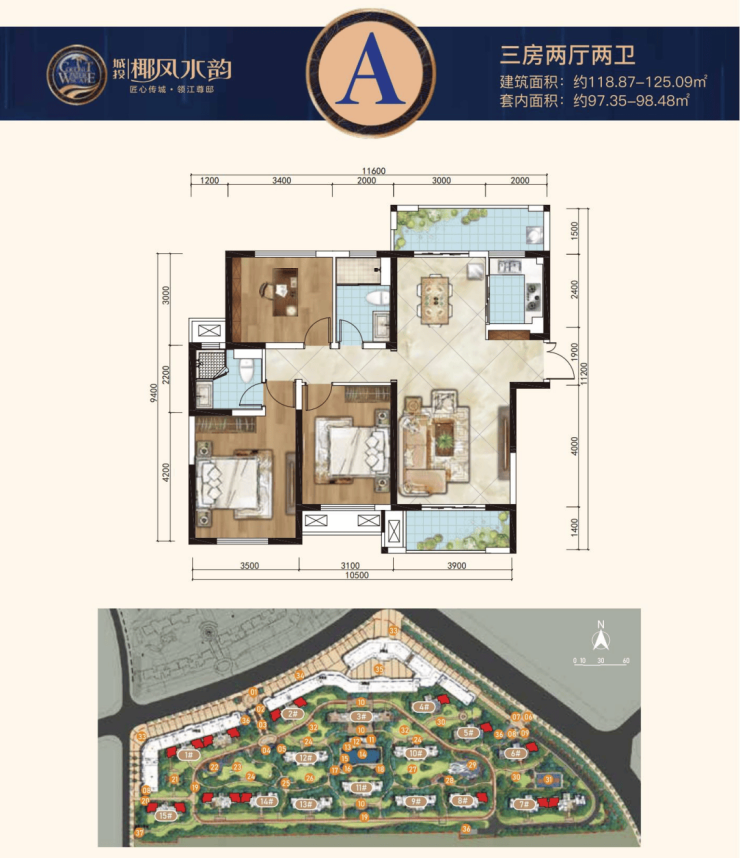 A户型:建面约118.87-125.09㎡三房两厅两卫