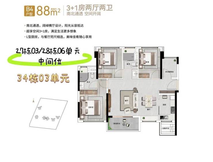 88㎡3+1房2厅2卫(竖厅)经典竖厅格局,三开间采光,近11平方米主卧套房设计,优享生活逸趣。