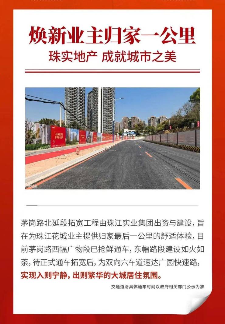 由珠江实业集团出资与建设的茅岗路北延段拓宽工程,旨在为珠江花城业主提供归家最后一公里的舒适体验。随着区域发展兑现,产业不断聚集,大量高素质人才涌入,周边配套进一步完善,项目价值潜力持续飙升。