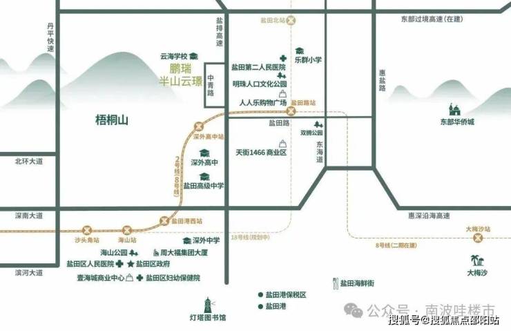 项目距8/2号线深外高中站直线距离约700m,直达罗湖福田,武深高速、惠深沿海高速、东部过境高速,盐田金色海岸码头,东部通航直升机主运行基地,执掌轨路海空多维交通,迭新城市极速生活圈。