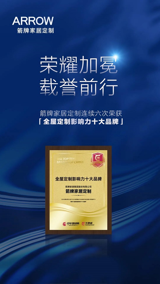 品牌的打造不是一朝一夕,建立起深入人心的品牌更绝非易事。箭牌家居定制凭借过硬的国民口碑,优秀的品牌实力,连续六次获得「全屋定制影响力十大品牌」奖。这份优异的成绩,充分展示了箭牌家居定制在家居行业的影响力和优秀的产品品质,以及箭牌家居定制强劲的品牌实力。