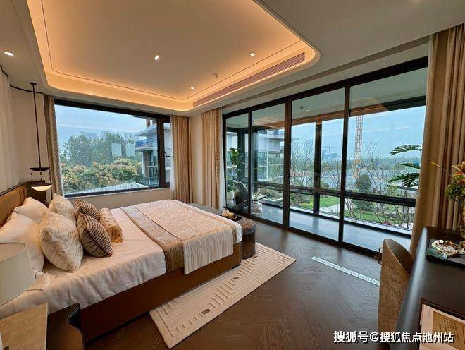 另一侧是休憩区域,超大主卧套房设计,还特地设置了一面巨幅落地窗。试想一下,未来早晨在卧室醒来,拉开窗帘的第一眼,便是晴朗的天空和绵延的江岸线,这种生活场景怎能让人不惊羡?