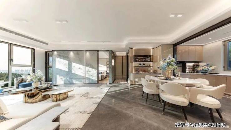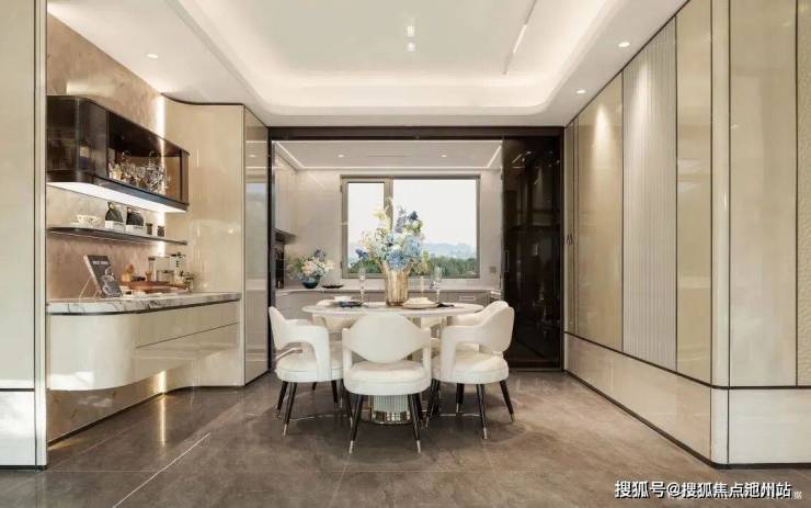 核心的家庭社交区——近37㎡的客餐厨一体化空间,采用“派对型厨房”设计,U型大操作台搭配圆桌,约3.9米面宽餐厅区域轻松安排6人圆桌+餐边柜,完美契合国人的团圆情结,让家庭聚会与亲友欢宴皆从容有度。