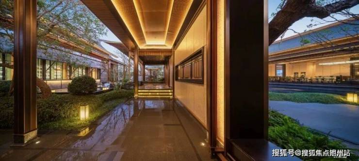 一进门・入境《千里江山图》。大门以《千里江山图》为灵感,采用宋制门堂对称格局,重檐坡屋顶展现极高规制。含两侧景墙总长约63米,两侧全冠移植的罗汉松与镇宅石麒麟,气势恢宏。